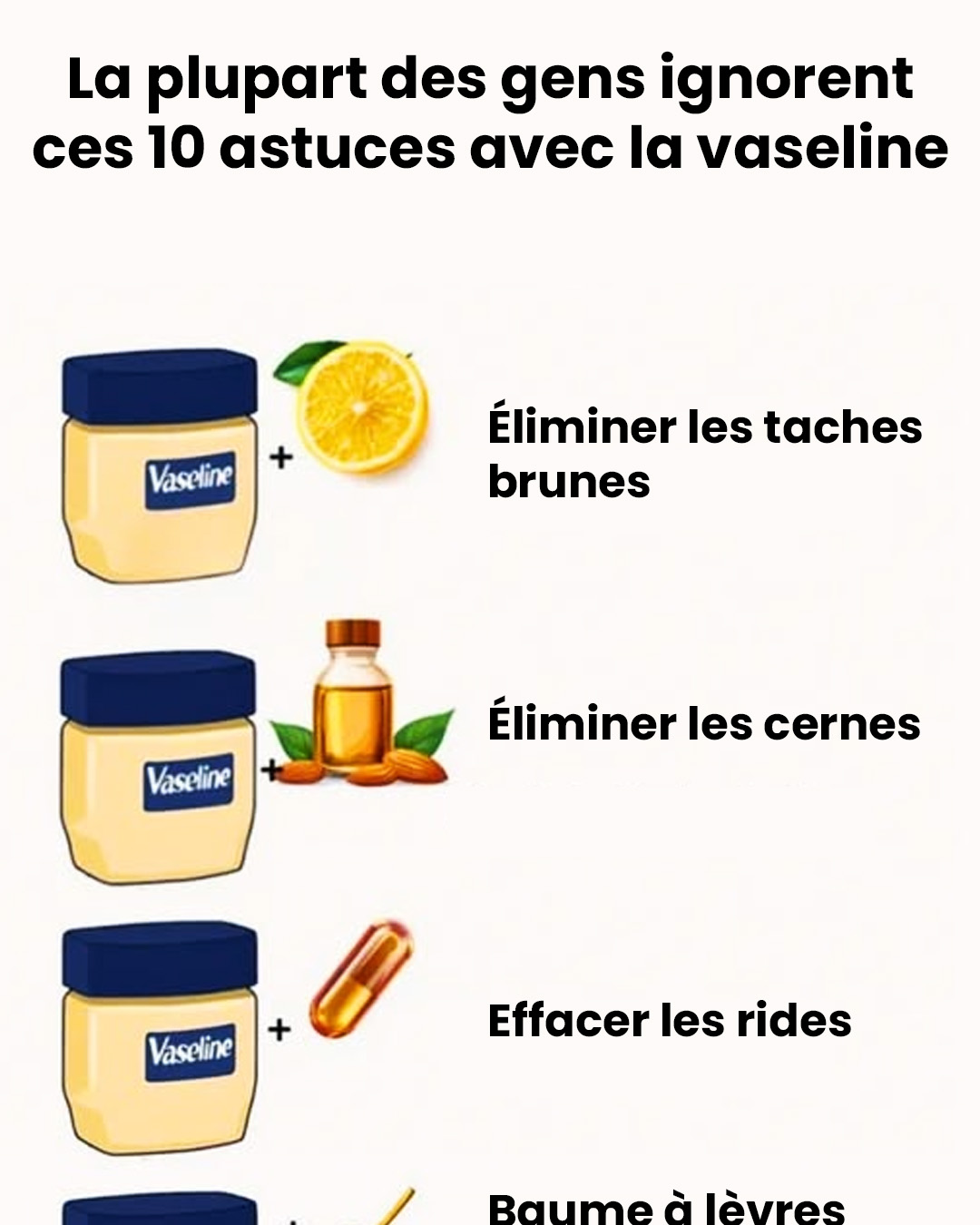 Vous avez repéré quelques taches sur votre visage ou vos mains ? Mélangez une noisette de vaseline avec quelques gouttes de jus de citron et appliquez le soir. Le citron aide à éclaircir, et la vaseline fixe les actifs sur la peau pendant la nuit. Un conseil : pensez à bien protéger votre peau avec une crème solaire le lendemain pour éviter l’effet inverse !