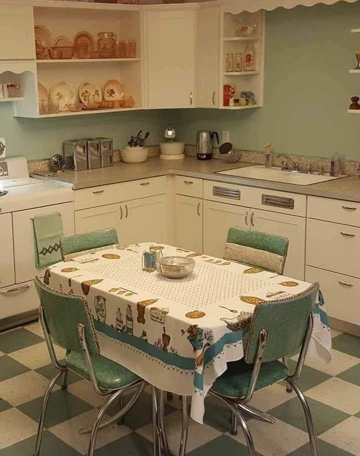 Le sol, avec ses nuances alternées de vert et de blanc, apporte une touche ludique, nous transportant dans les cuisines des années 1950, où simplicité et raffinement se rencontraient. Sur le plan de travail, quelques appareils modernes se fondent harmonieusement dans le charme authentique de la cuisine.