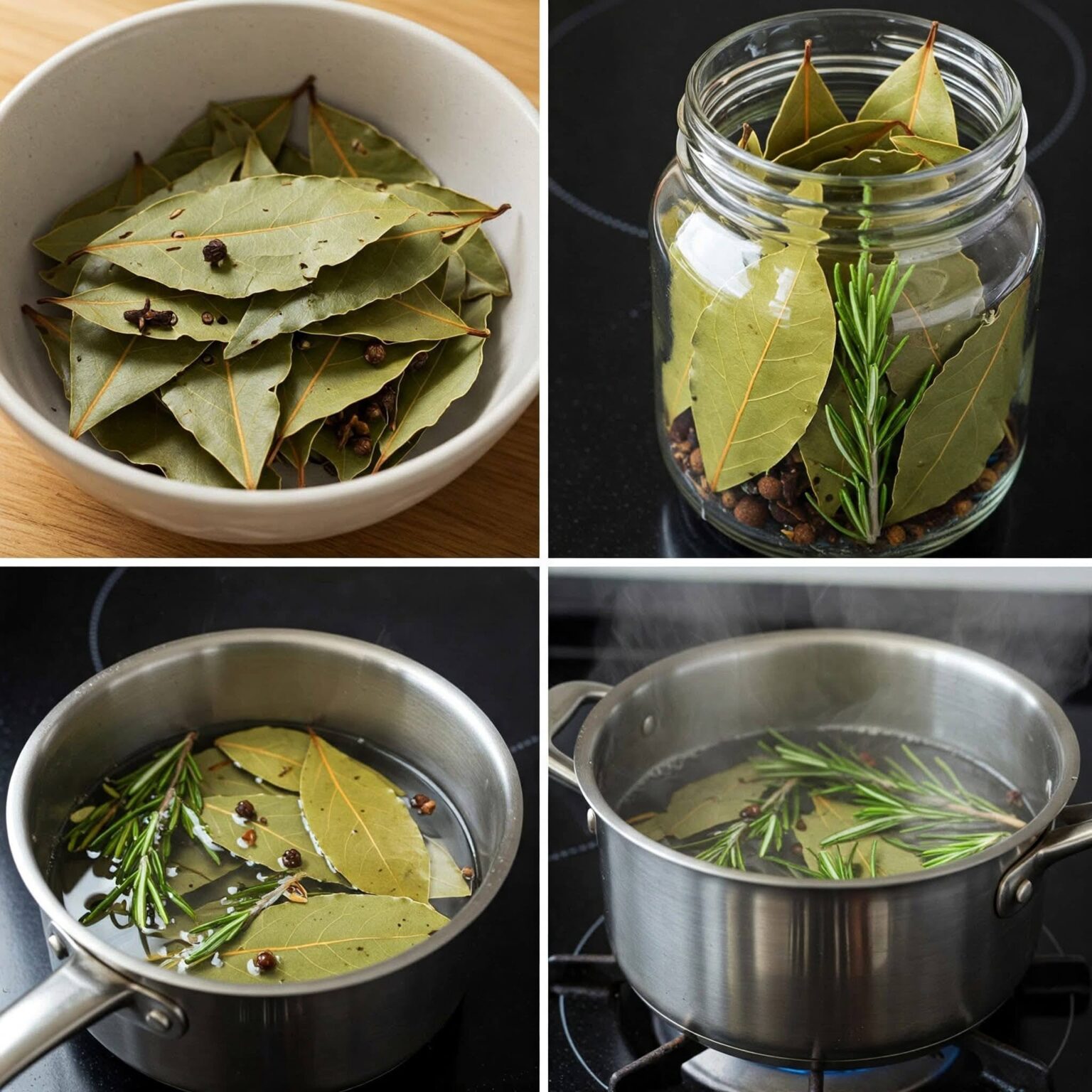 Faites bouillir les ingrédients : Dans une casserole, ajoutez les clous de girofle, les feuilles de laurier, le romarin et l’eau. Portez à ébullition à feu doux jusqu’à ce que l’eau prenne une teinte foncée.
