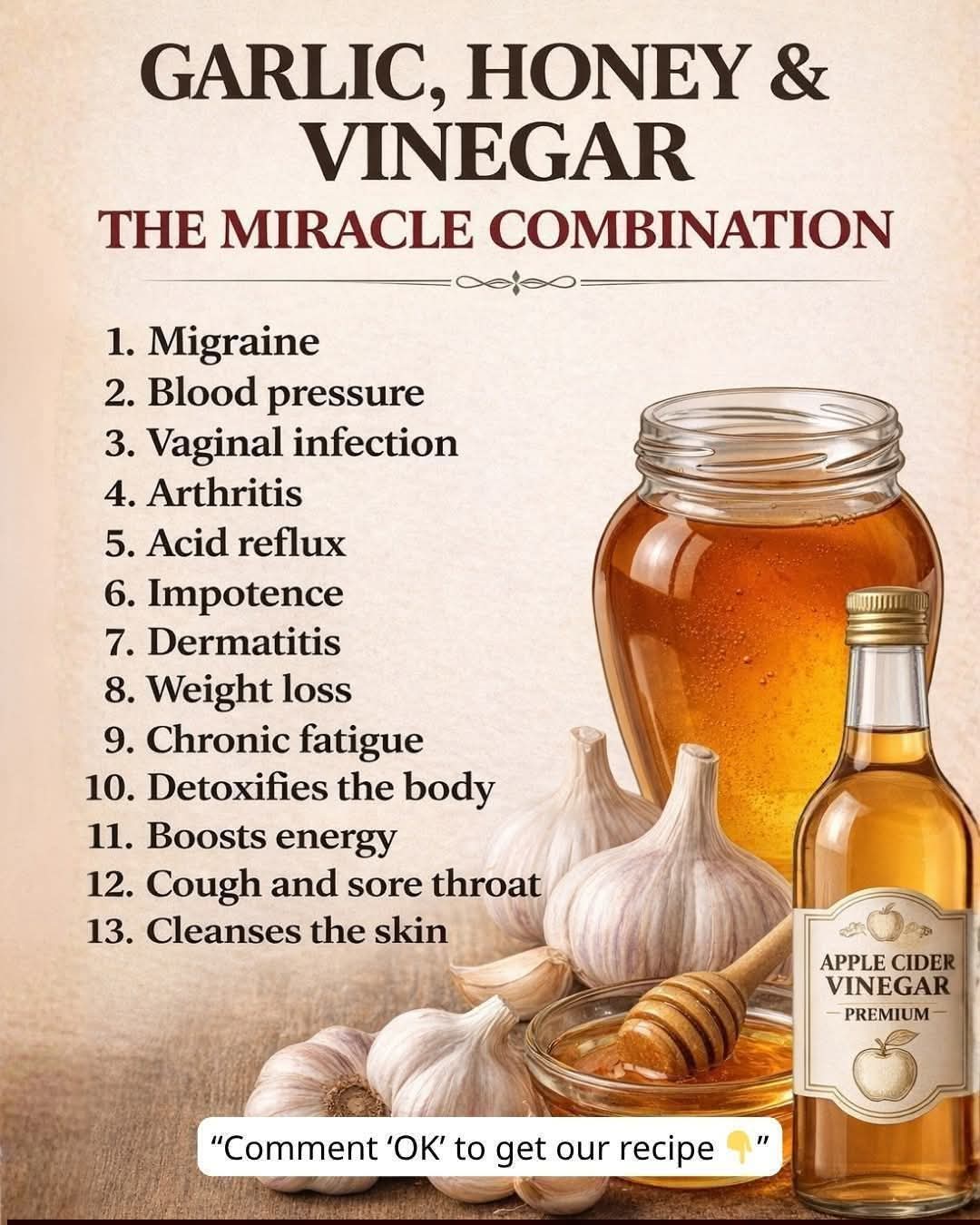 Why Combine Garlic, Honey, and Apple Cider Vinegar?Each ingredient has its own health-promoting properties:Garlic: Contains allicin, known for antimicrobial and anti-inflammatory effectsHoney: Natural soothing agent with antibacterial propertiesApple cider vinegar (ACV): May support digestion and blood sugar control👉 Together, they are often used in home remedies for general wellness.Potential Benefits of This Natural Mixture1. May Help Soothe Sore Throat and CoughHoney can coat the throat and reduce irritation, while garlic and vinegar may help fight certain bacteria.✔ Commonly used during colds and flu.2. Supports Immune FunctionGarlic contains compounds that may enhance immune response, while honey provides antioxidants.⚠️ It supports immunity—but does not replace medical treatment.3. May Aid DigestionApple cider vinegar is believed to:Promote stomach acid productionImprove digestionSome people find it helpful for mild digestive discomfort.4. Anti-Inflammatory PropertiesAll three ingredients have anti-inflammatory compounds that may help reduce mild inflammation in the body.5. Heart Health Support (Limited Evidence)Garlic has been studied for its potential to:Lower cholesterolSupport cardiovascular healthHowever, results vary and depend on overall lifestyle.Important: Common Claims vs RealityYou may see claims that this mixture can treat:MigrainesHigh blood pressureInfectionsArthritisWeight lossChronic fatigue“Detox” the body👉 There is no strong scientific evidence that this mixture can cure these conditions.It may support general health, but it is not a miracle remedy.How to Prepare Garlic, Honey, and Vinegar MixtureIngredients:4 cloves of garlic½ cup of honey1 cup (250 ml) apple cider vinegarInstructions:Place all ingredients into a glass jarClose the lid tightlyShake well to mix thoroughlyStore in a cool placeHow to UseTake 1 tablespoon between mealsOr when experiencing a sore throat👉 It is best consumed fresh, ideally within a few days to maintain quality.Safety and Precautions⚠️ Keep in mind:Excess garlic may cause stomach irritationApple cider vinegar is acidic and can damage tooth enamel if overusedNot suitable for people with certain medical conditions (consult a doctor)Final ThoughtsGarlic, honey, and apple cider vinegar can be a helpful natural combination for minor issues like sore throat or mild digestive discomfort. However, it is not a cure-all solution.👉 For best results:Use in moderationCombine with a healthy lifestyleSeek medical advice for serious conditions