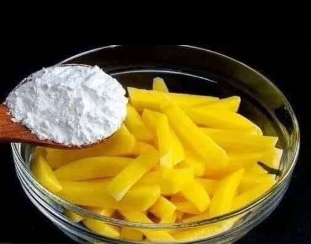 - Poussière avec fécule de maïs Placez les bâtonnets de pommes de terre secs dans un bol et saupoudrez de fécule de maïs. Faites défiler lentement, cette partie est importante