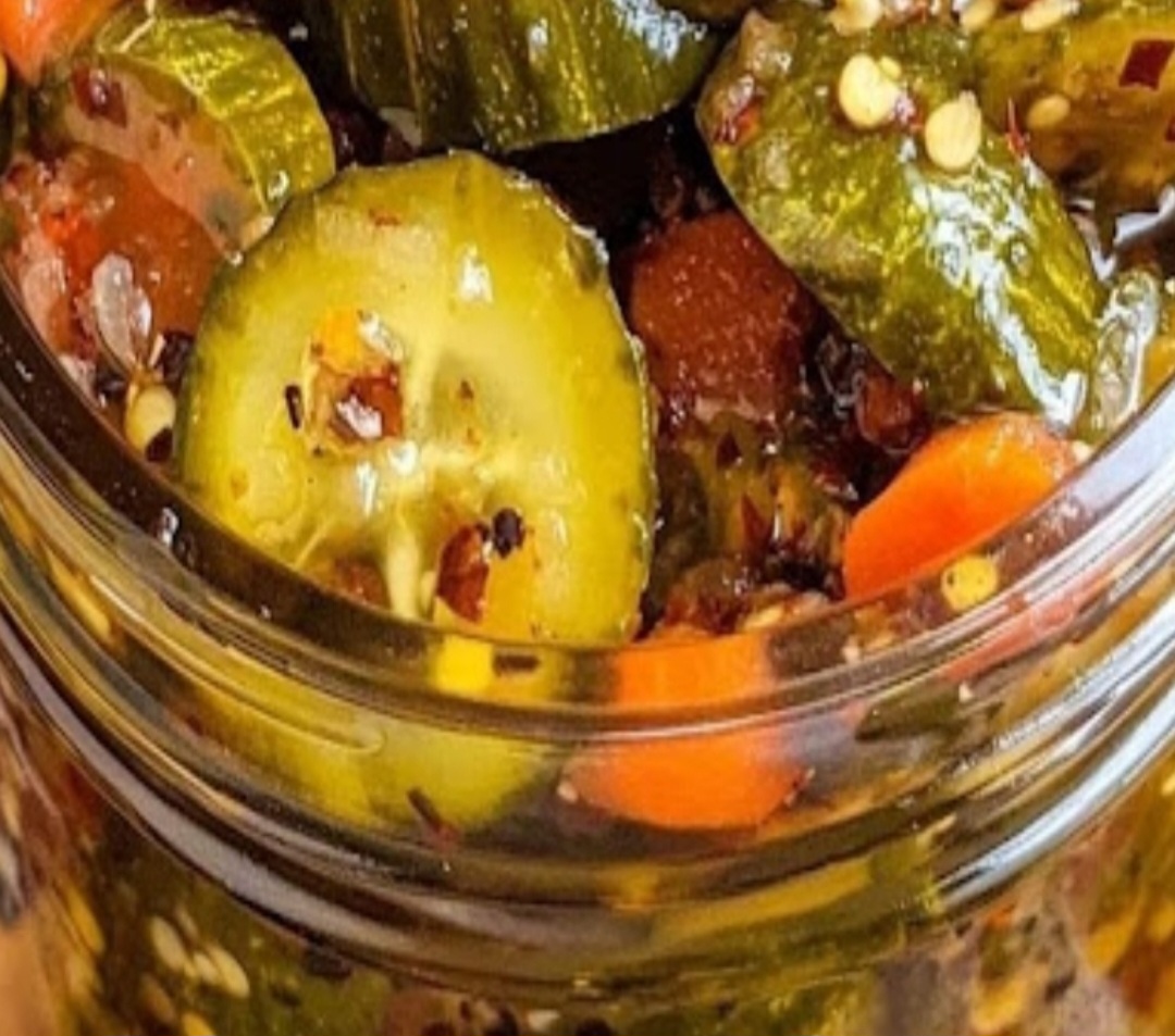 épices dans le bocal, en veillant à ce que tout soit complètement immergé. Vous devrez peut-être appuyer sur les légumes avec une cuillère pour éliminer les bulles d’air.Laissez le pot refroidir à température ambiante avant de le fermer avec un couvercle.Mariner:Une fois le bocal fermé, placez-le au réfrigérateur. Laissez mariner les cornichons pendant au moins 24 heures avant de les servir pour une saveur optimale. Cependant, ils auront encore meilleur goût après 2 à 3 jours.Servir:Ces cornichons épicés à l’ail et à l’aneth peuvent être servis en accompagnement de sandwichs, de hamburgers ou comme collation. Ils peuvent également ajouter du croquant et de la saveur aux salades.Stockage:Ces cornichons peuvent être conservés au réfrigérateur jusqu’à 1 mois. Veillez toujours à ce que les cornichons restent immergés dans la saumure pour préserver leur qualité et leur sécurité.Conseils:Ajuster le degré d’épices : Si vous préférez moins de piquant, réduisez la quantité de flocons de piment rouge. Pour plus de piquant, vous pouvez ajouter un piment jalapeño tranché ou augmenter la quantité de flocons de piment rouge.Variations de légumes : N’hésitez pas à expérimenter avec d’autres légumes comme les radis, le chou-fleur ou les poivrons.Enjoy!