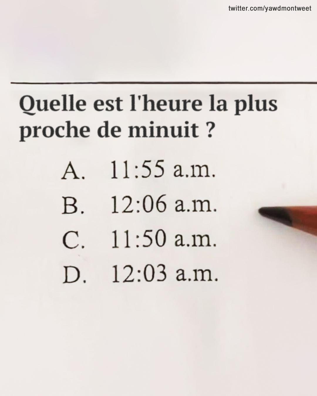 “L’heure la plus proche de minuit serait D. 12 h 03.”
